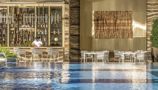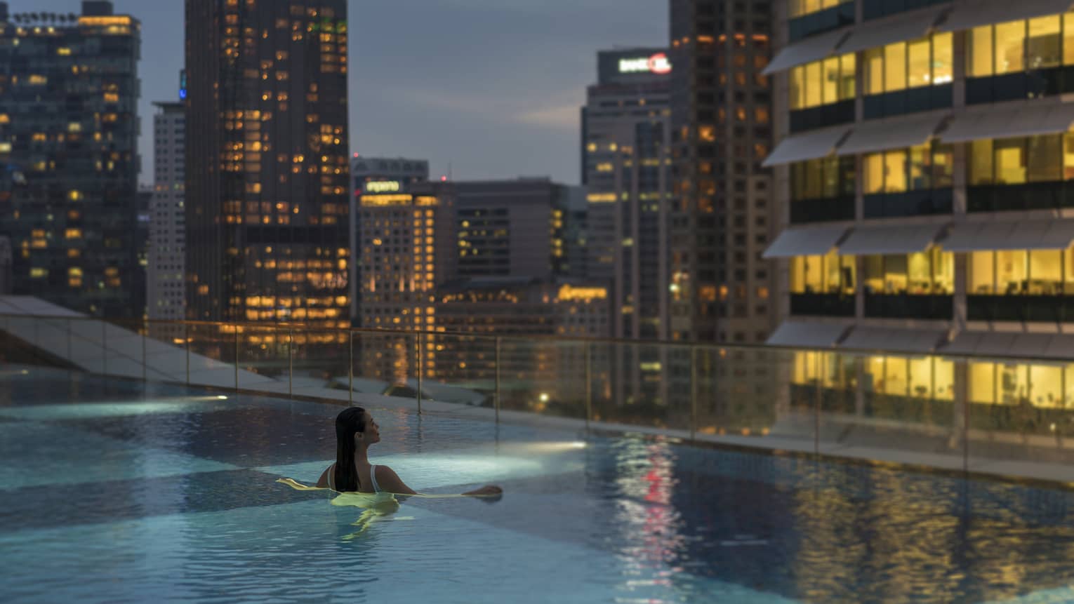 Pool Garden View Room ca. 60 qm: Blick auf Pool und Skyline.