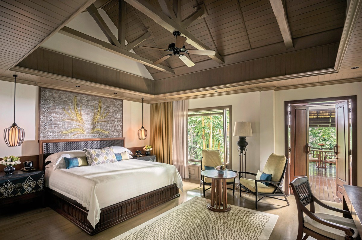 Veranda im Thai-Stil, Esstisch, gestaltet mit Kingsize- oder zwei Twin-Betten, Bad, separater Dusche, Föhn, Bademantel, TV, iPod-Dockingstation, Minibar, Kaffee-/Teezubereiter und Safe.